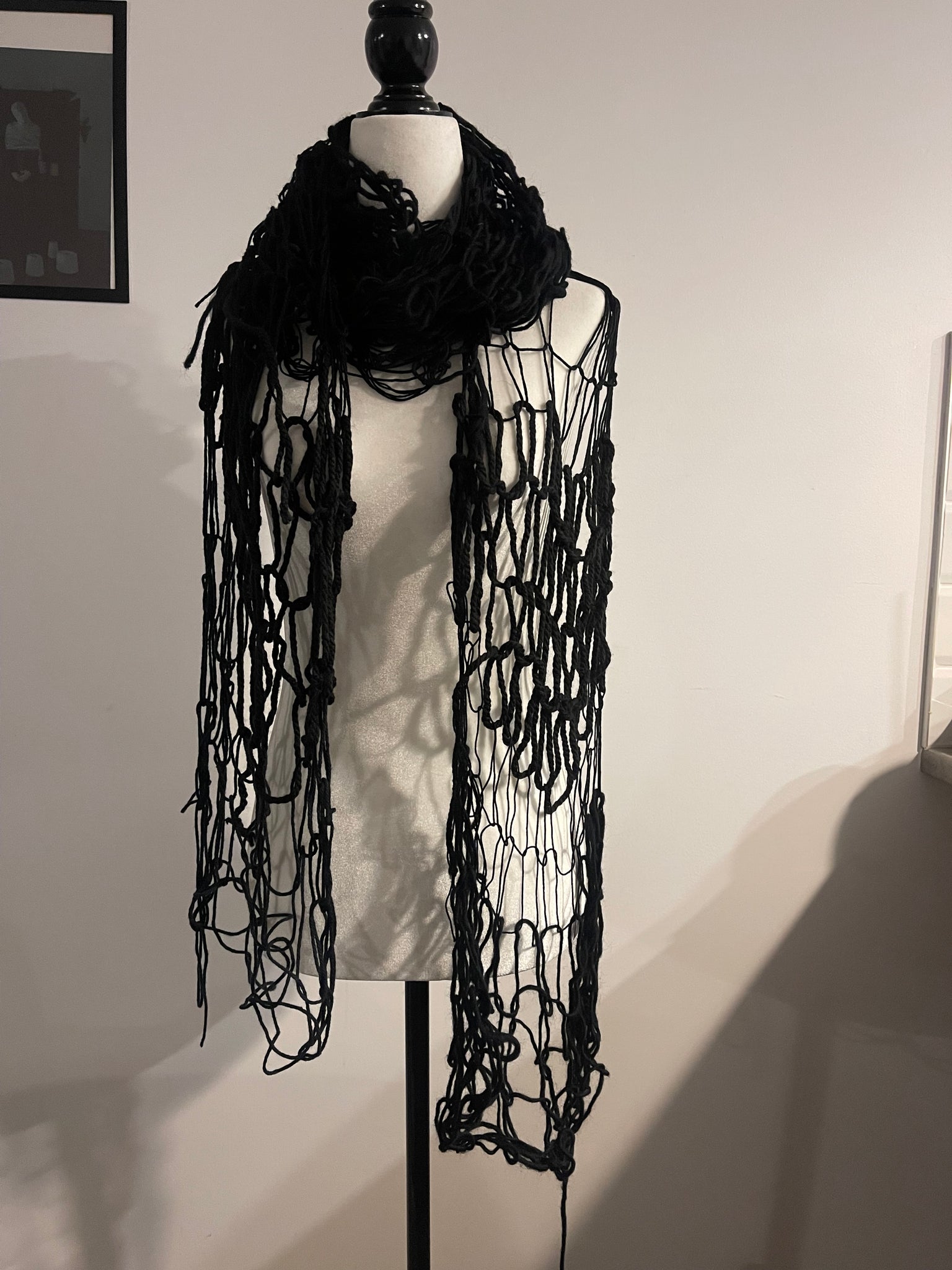 This scarf is a combination of a previous oversized scarf design and the Wasteland line. Because of the size of the stitches, pulled stitches will happen. The beauty of this scarf will blossom as it ages and stitches become uneven combined with the variety of fibers used, creating a gorgeous texture. Despite the length, this scarf is fairly thin and you will able to wrap it all the way without creating that much bulk.