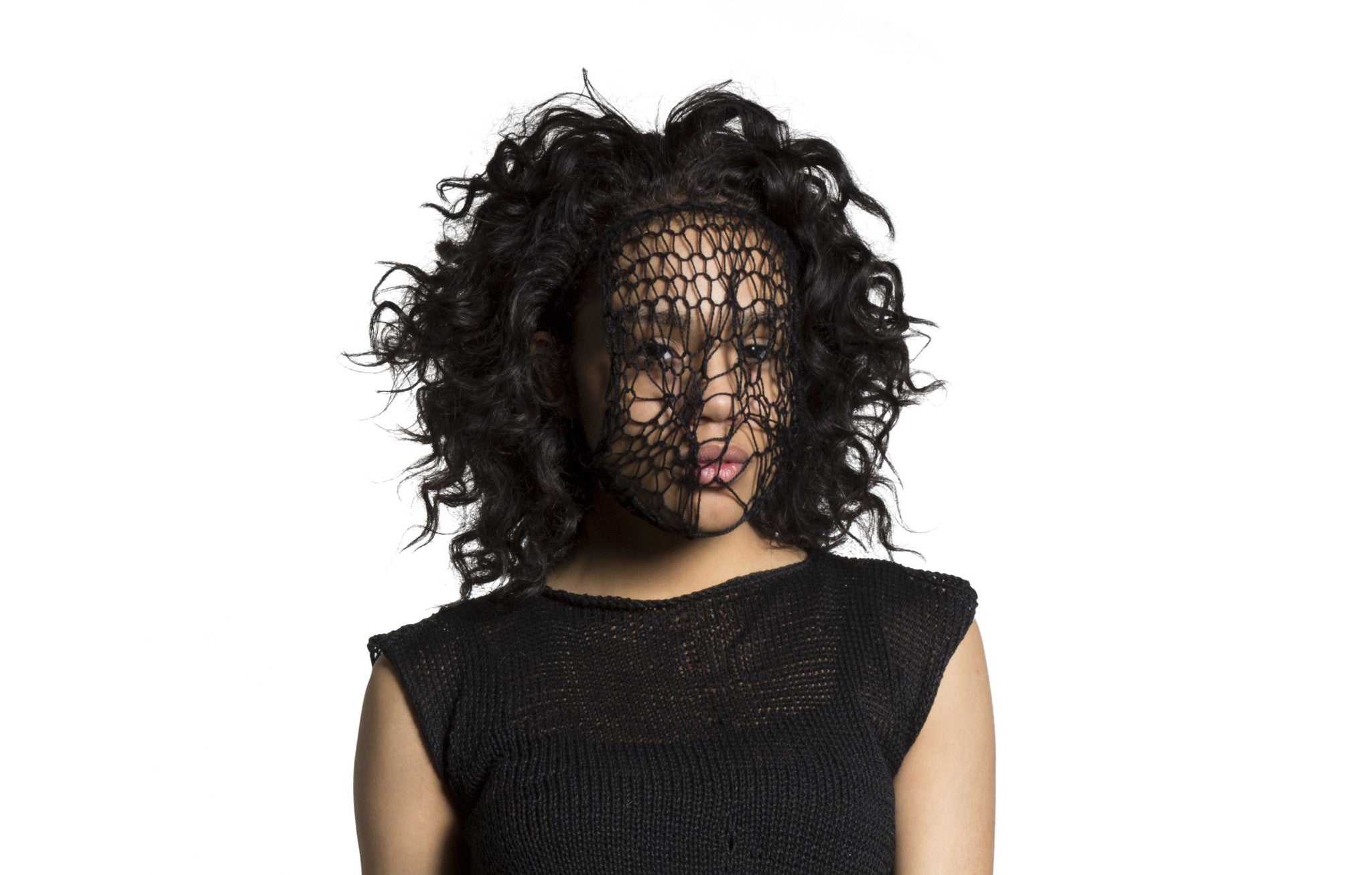 Varying gauge knit creates mottled texture. Fastened with behind-the-ear crocheted straps.